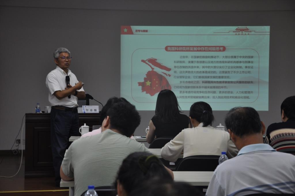 會上,鄢國強作了《改革激活,創新發展——科研院所改革歷程及展望》的專題黨課。他以科研院所的定義與起源為開篇,以我國科研院所的整體概況、建設與發展以及上海科研院改革發展變遷為主要脈絡,通過具體數據和案例,帶領大家回顧了我國乃至上海科研院所改革發展歷程,總結了70年科技事業的五個重要里程碑,并以國內外較為成功的科研機構運營模式為啟發,深刻剖析了我國科研院所發展存在的問題,提出了支撐三種模式(事業單位科研院所、轉企院所、新型研發機構)的科研機構有序發展的思路。最后,鄢院長結合當前國際形勢,思考和展望了在現今百年未有之大變局背景下科研院所未來發展的前行方向。專題黨課觀點鮮明、脈絡清晰、令人深思、催人奮進,由此給在座黨員帶來啟示:回眸歷史,我們要回首不忘來時路;把握當下,我們要勵精圖治沐風雨;展望未來,我們更要砥礪前行求奮進。